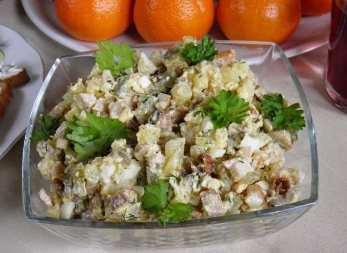Второй основной ингредиент — свежесваренное мясо. Самый вкусный вариант салата — это сочетание основных продуктов в пропорции 1:1. Можно комбинировать разные мясные сорта, соединять его в равных пропорциях с языком или использовать варено-копчёное мясо.