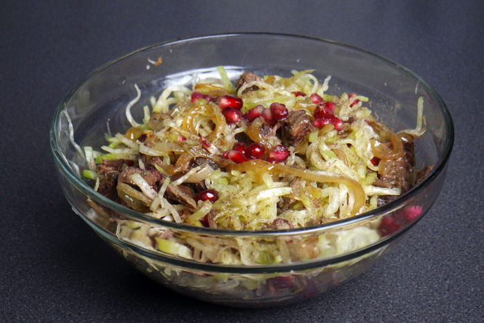- Добавить мясо в миску к редьке. Лук в салат можно добавлять и предварительно обжаренный на масле до золотистого цвета. Посыпать зернами граната. Добавить соль и специи.