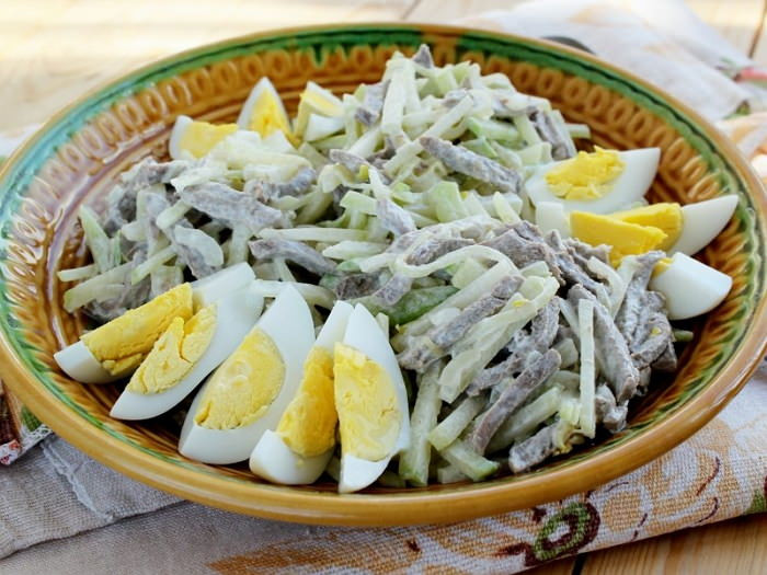 - Мясо говядины также нарежьте соломкой. Яйца для салата нужно отварить вкрутую в подсоленной воде 8-10 минут, а затем поместить в холодную воду. Очищенные яйца нарежьте на 6-8 ломтей.