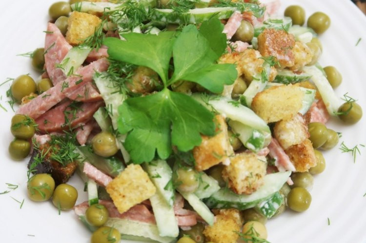 2. Салат с колбасой, зеленым горошком и кириешками