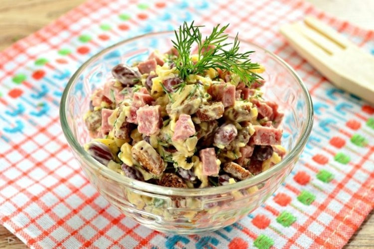 3. Фасолевый салат с кириешками и колбасой