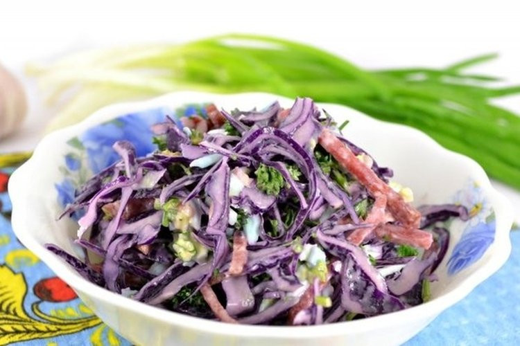 13. Салат с кириешками, краснокочанной капустой и колбасой