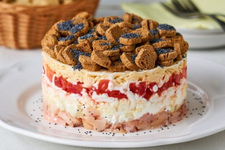 4. Слоеный салат с кириешками, сыром и ветчиной