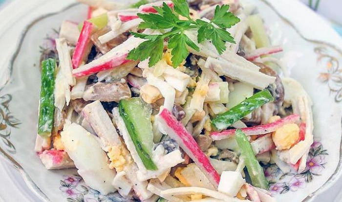 Крабовый салат с вареной картошкой и грибами