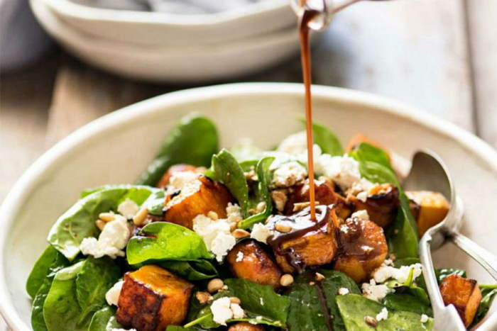 - Выложить шпинат в миску, залить заправкой, аккуратно смешать. Затем выложить зелень на красивую тарелочку, поверх шпината — ломтики тыквы и присыпать кедровыми орешками.