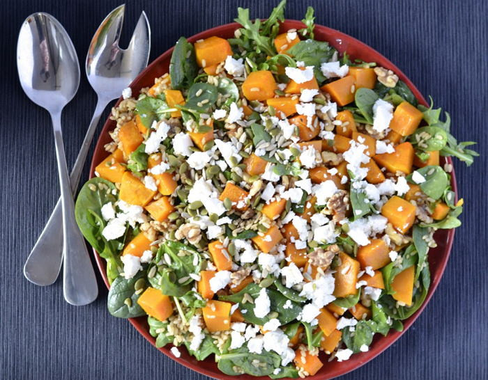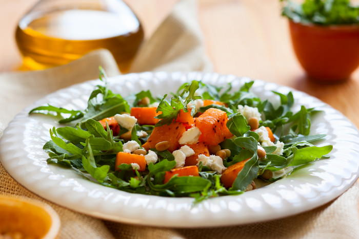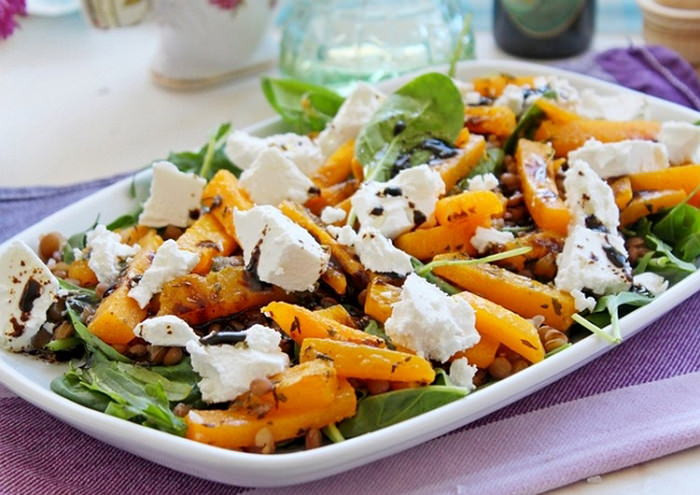 - Сдабривают салат с запеченной тыквой маслом, солью и перцем.