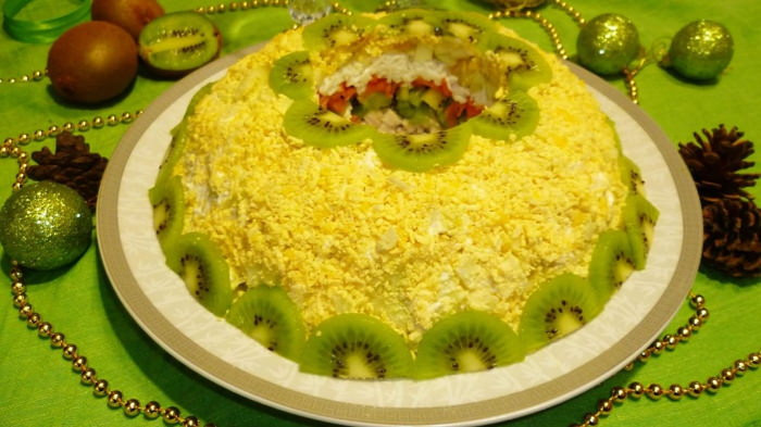 - Украшается салат ломтиками киви, что придает блюду тот самый оттенок малахита. Форма и количество фрукта зависит от фантазии повара.