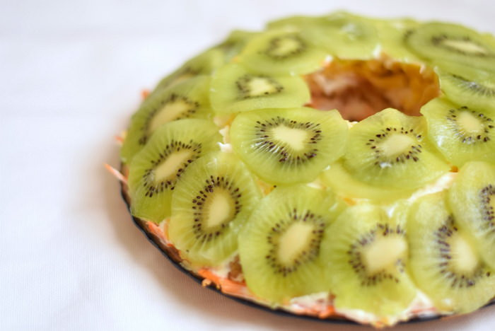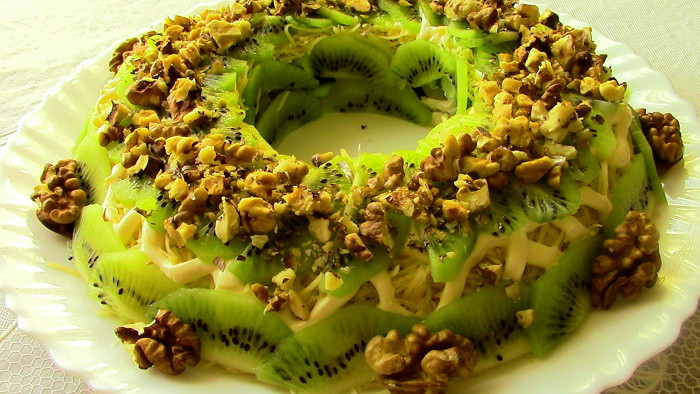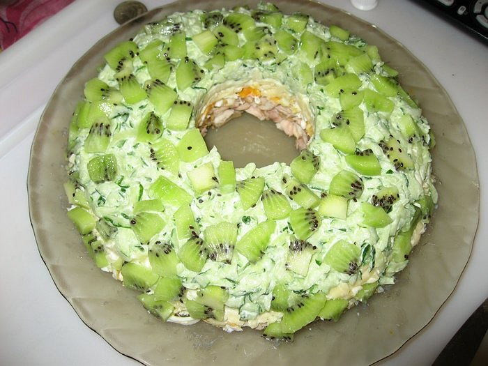 - Оформить блюдо в виде кольца. Киви почистить, разрезать пополам и нарезать тонкими дольками. Выложить дольками киви боковины, край салата и вокруг внутреннего кольца.
