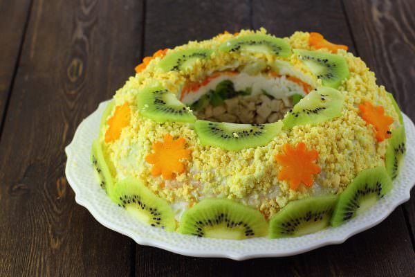 - В центр плоского блюда поставить стакан, вокруг него выкладывать слоями подготовленные измельченные ингредиенты, формируя кольцо: куриные яйца, зеленый лук, волокна куриного филе, чернослив, киви, отварная морковь и твердый сыр. Не забывать промазывать каждый слой майонезом.