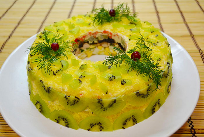- Вынуть из центра салата стакан и украсить кольцо со всех сторон тонкими слайсами киви.