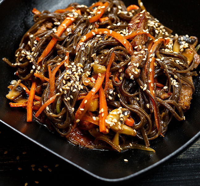 - Морковку очистить от кожуры, затем натереть на крупной терке. Лук очистить от шелухи, мелко нарезать. Затем на разогретую сковородку налить растительное масло. Выложить лук и морковку. После добавляем нарезанные грибы. Также измельчим чеснок и добавим к грибам. На свой вкус солим и перчим. За две минуты до готовности кладем также лапшу, немного прогреваем, поливаем соевым соусом и выключаем.