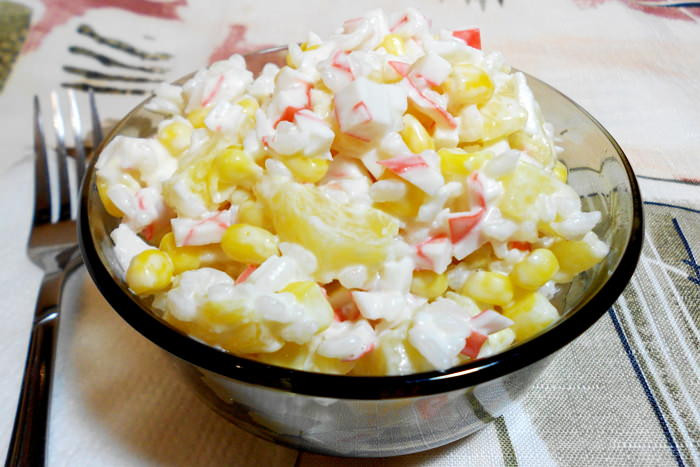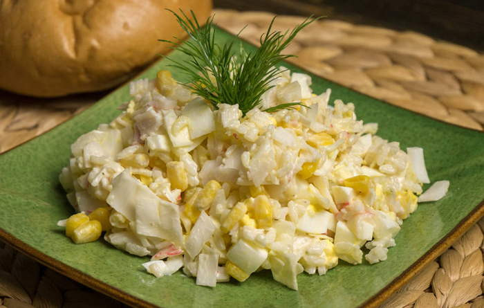 - Хорошо перемешиваем все ингредиенты салата с майонезом. Выкладываем крабовый салат с рисом и кукурузой в салатник, украшаем луком, а так же кусочками крабовых палочек. Подавать салат к столу можно как в общем салатнике, так и порционно.