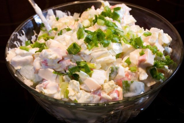 Нежность и мягкость салату придадут крабовые палочки и сметана. А вкус будет немного напоминать копченую рыбку.Ингредиенты: