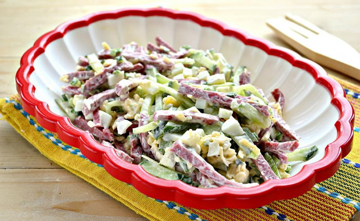 Если вы используете колбасный копчёный сыр – немного заморозьте его перед приготовлением салата. Так он проще нарезается или натирается.Лучшей заправкой для таких салатов считается сметана или майонез.