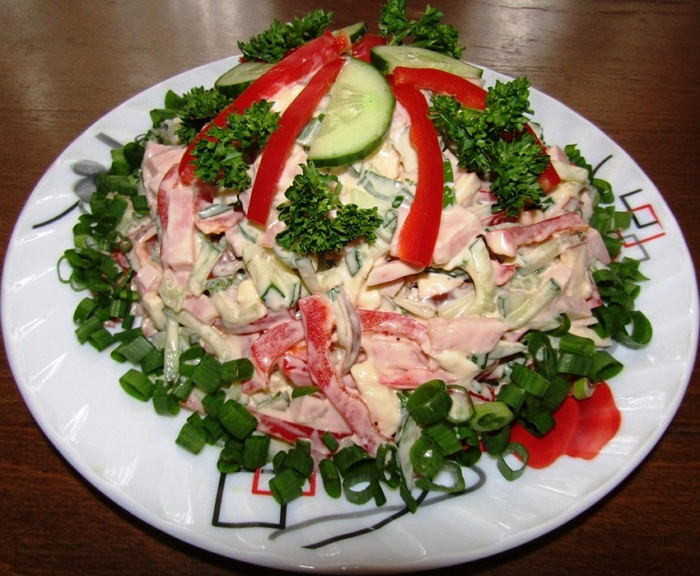 Салат с копченым сыром – это оригинальный рецепт, наполняющий блюдо неповторимом вкусом. Салаты с копченым сыром настоящее лакомство, особенно для мужской половины. Приятный аромат и вкус мяса в сочетании с сочными свежими овощами и зеленью – прекрасное дополнение к семейному ужину.