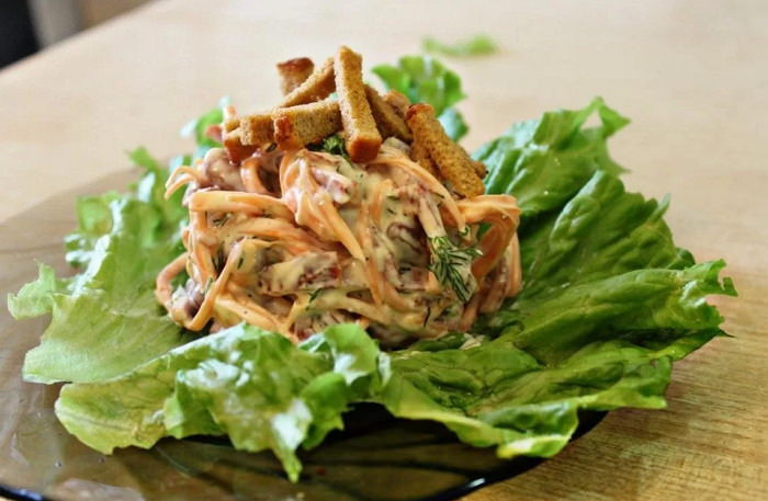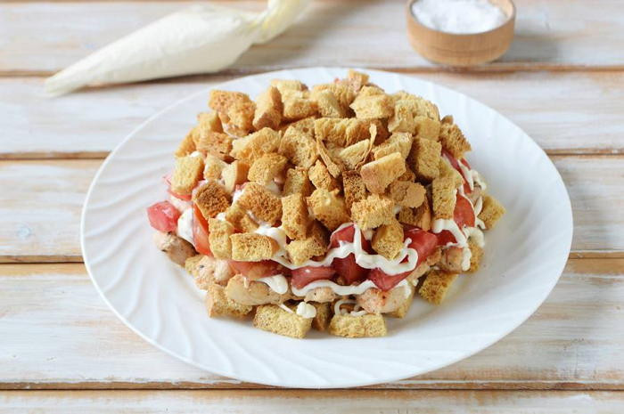 - Чеснок пропустить через чесночницу, смешать с майонезом и заправить салатик. Перед подачей салат посыпать сухариками.