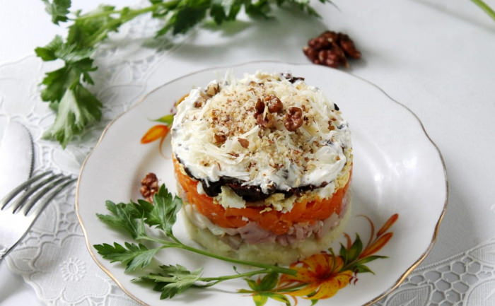 Питательное, да и не менее праздничное блюдо. В отличие от других салатов, гармонично будет сочетаться как в праздничном меню, так и в качестве основных блюд на каждый день.