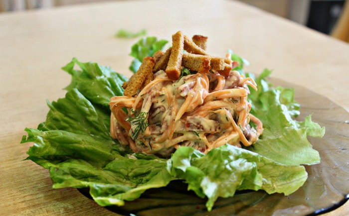 - Тщательно размешиваем салат, чтобы все компоненты равномерно напитались майонезом и пряностями. Украшаем салат и подаем его к столу.