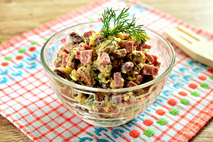 - Все ингредиенты смешать в одном салатнике. Добавить соль перец и майонез. Перемешать салат с фасолью и копченой колбасой. Украсьте веточками зелени.
