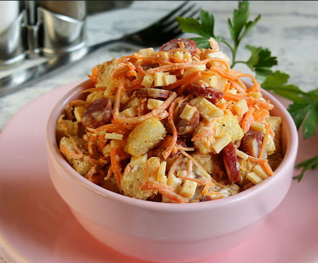 - Все первые три слоя обязательно нужно промазывать майонезом именно в виде сеточки, чтобы не размякли сухарики и помидоры. Украшаем по желанию верх салата колбасой, желтком и зеленью.