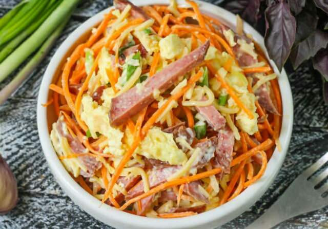 - Соединяют вместе корейскую морковь, сервелат, блинчики из яиц, фасоль, сыр, аккуратно перемешивают, выкладывают горкой в салатник, украшают веточками зелени.