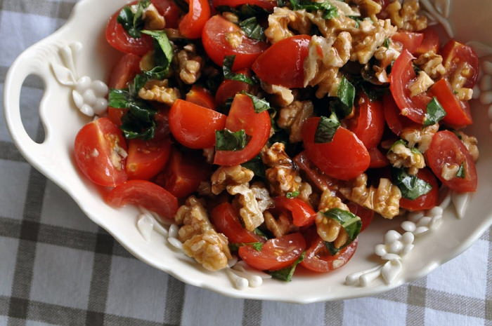 - Взять миску или салатницу. Нашинковать листья салата так, как желаете. Конечно, лучше крупно. Добавить помидорок “черри”. Обжаренных уже грецких орехов.