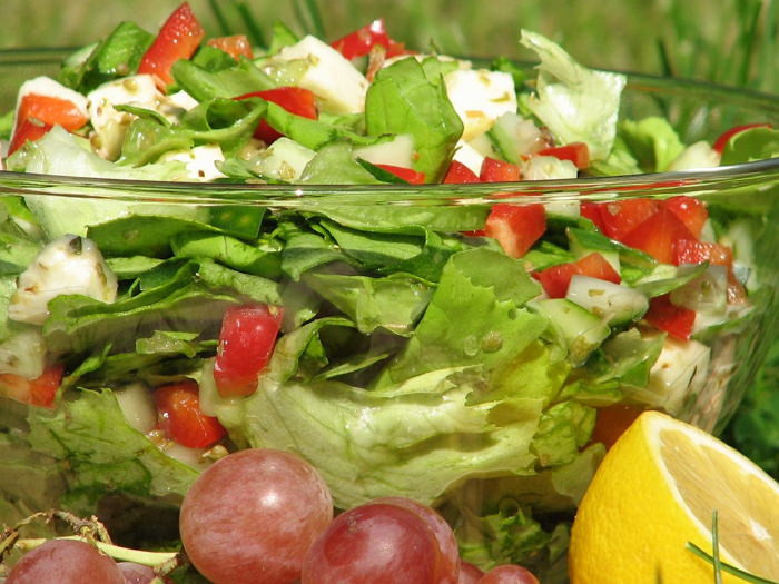- Сыр нарезать квадратиками. Затем следует все ингредиенты перемешать, посолить по вкусу и немного поперчить. Заправить все лимонным соком и оливковым маслом. Сверху салат посыпать зеленью. Вкусный и легкий салатик готов.