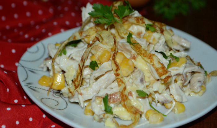 Салат на скорую руку с кукурузой и яичными блинчиками