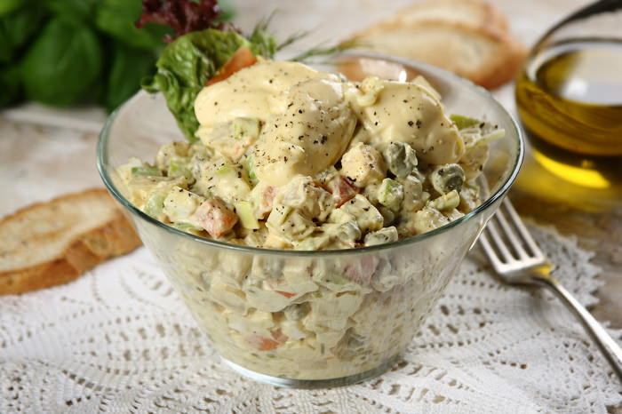 - Если Вы приготовили слишком большое количество салата впрок, не заправляйте его майонезом, иначе он испортится. Всегда добавляйте данный ингредиент непосредственно перед подачей. При этом помните, что блюдо не должно быть сухим, поэтому не жалейте заправки.