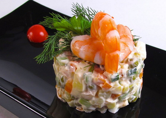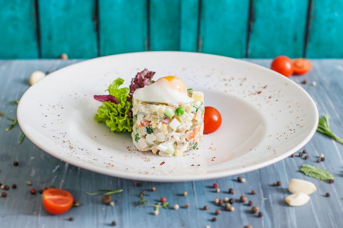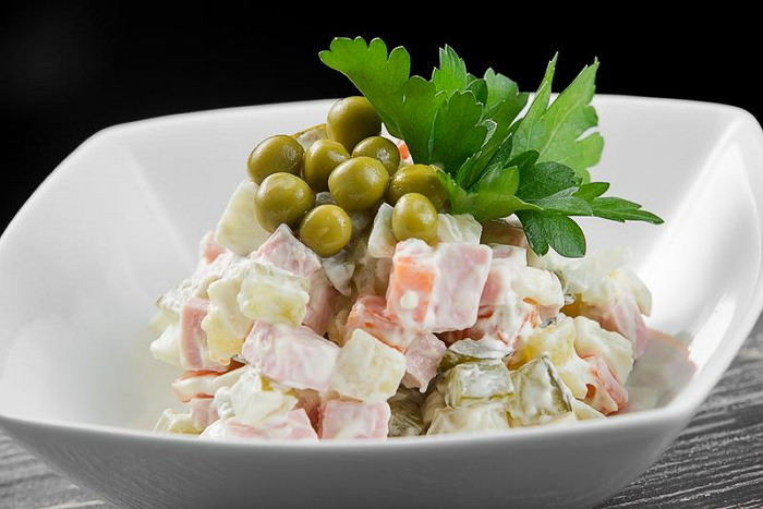 - Выкладываем столичный салат в салатник или порционно на блюдо, придавая ему форму кулинарным кольцом.