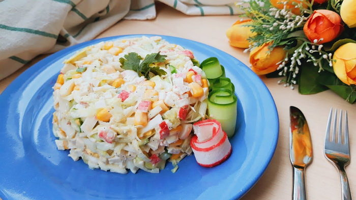 - Заправить майонезом, еще раз перемешать. При необходимости добавить соль.