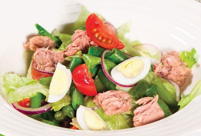 - Выложенные на порционную тарелку овощи украшаем теплой фасолью, яйцом и анчоусами. Основной ингредиент салата Нисуаз – кусочки тунца, выкладываем на вершину, что сделает его подачу более эффектной.