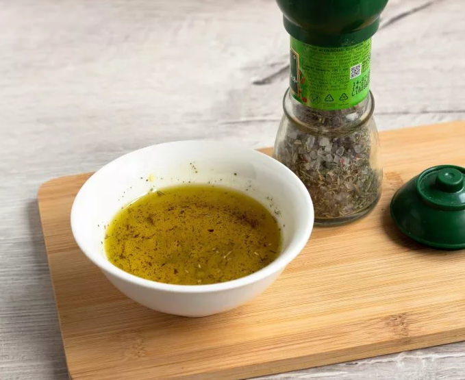 - Для приготовления заправки необходимо смешать оливковое масло, винный уксус, коричневый сахар, горчицу, соль и черный молотый перец. Чеснок очистить, промыть, мелко порубить, добавить к заправке и все тщательно перемешать. Заправку накрыть и оставить настояться в течение 20 минут.