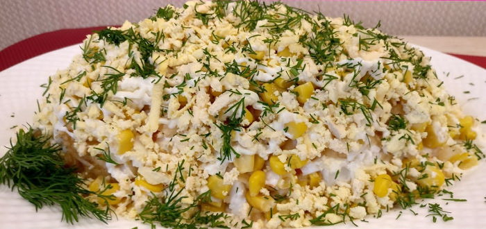 - Салат выкладываем слоями: Редька, картофель, майонез, морковь, майонез, белки, яблоко, кукуруза, майонез, желток.