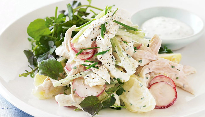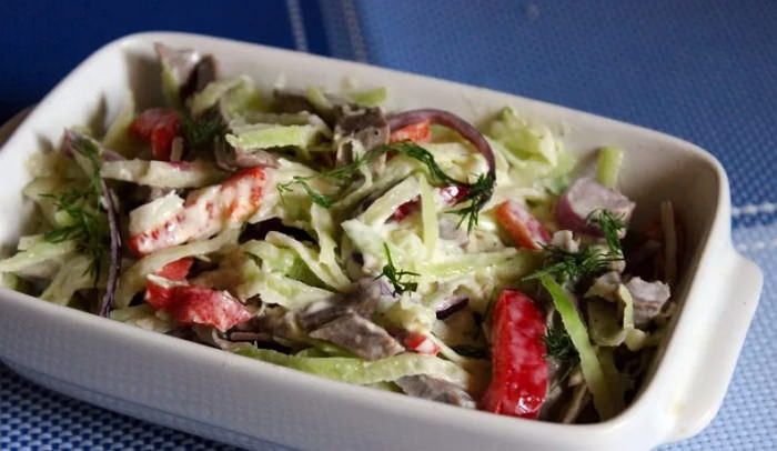 - Соединить все продукты, посолить по вкусу, добавить майонез или сметану. Выложить в салатник.