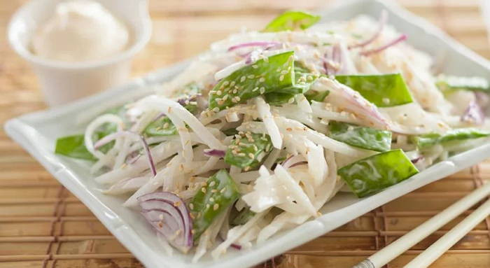 - В салатнике соедините горошек, нашинкованный лук и измельчённый дайкон. Заправьте приготовленным соусом, перемешайте, отправьте на 1 час в холодильник;