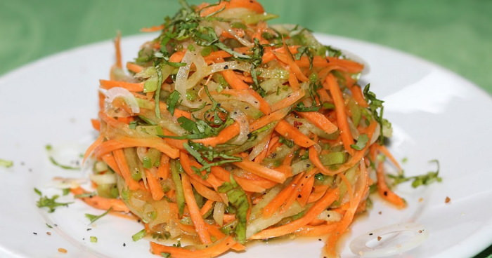 - Салат из редьки с морковью и морской капустой можно украсить зеленью.