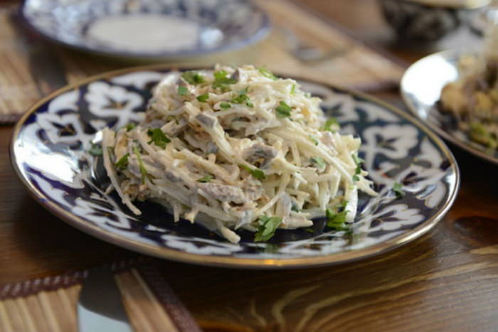 - Салат из маргеланской редьки готов. По желанию его можно украсить.