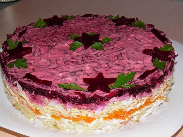 - Далее тертая свекла и щедро промазываем майонезом. Овощи я не солила, так как майонез достаточно соленый, перец молотый тоже использовать по желанию.