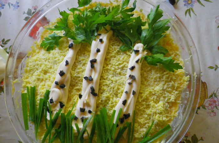 - Пятый, завершающий слой – натертый желток. Можно украсить салат березкой, при помощи зеленого лука сделать листву, полоса майонеза послужит стволом, а характерные пятна березы можно сделать из огурца или маслин.
