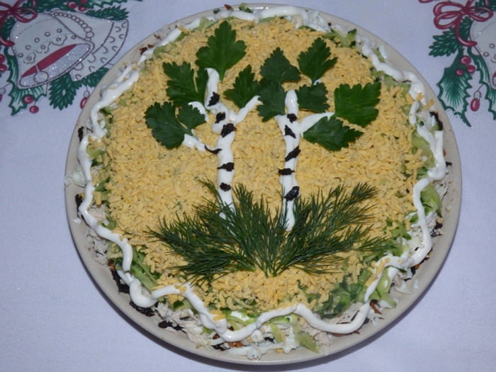 - Сверху салат аккуратно смазывается майонезом, украшается зеленью петрушки и черносливом или маслинами в виде берёзки.