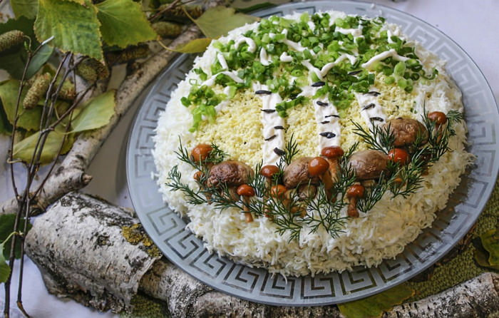 - Осталось только украсить салат. Майонезом нарисовать стволы и ветви берез, маленькие кусочки чернослива распределить на белых стволах, листья березы сделать из листьев петрушки, из укропа выложить траву. Готовый салат поставить в холодильник.