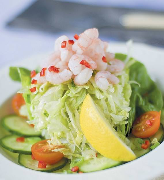 Креветки отварите в соленой воде до готовности. Откиньте на дуршлаг, остудите. Листья салата вымойте и обсушите. Огурец порежьте кружками, помидоры — на половинки. Пекинскую капусту измельчите. Перец без семян нарежьте мелкими кубиками. Выложите на плоскую тарелку листья салата, половинки черри и кружочки огурца, посолите. Сверху поместите подготовленную пекинскую капусту, на нее — креветки. Посыпьте кусочками болгарского перца, сбоку положите четвертинку лимона.