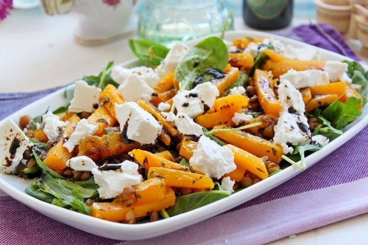 Очистить тыкву, нарезать небольшими кубиками. Смешать нарезанную тыкву с оливковым маслом, кумином и паприкой. Выложить тыкву на противень, запекать 25–30 мин при 200 °С до мягкости. Остудить. Замочить чечевицу на 10 мин, промыть, снова залить водой, посолить, отваривать 20–30 мин до мягкости. Подержать готовую чечевицу под холодной водой. Мелко нарезать или покрошить мягкий сыр. Мелко нарезать листочки мяты. Смешать мяту, оливковое масло, укус, соль и перец. Выложить на тарелку рукколу, чечевицу, тыкву. Полить заправкой. Посыпать сверху нарезанным мягким сыром.