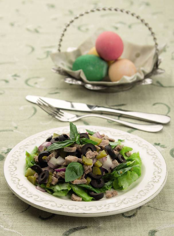 Отварить в подсоленной воде мясо до готовности (примерно 30 мин после закипания). Нарезать готовую телятину ломтиками толщиной не более 3 мм. Очистить лук, нарезать средними кубиками (7х7 мм). Нарезать огурцы тонкими ломтиками. Нарезать маслины кружочками. Соединить для заправки горчицу с медом. Выжать в соус лимонный сок. Влить тонкой струйкой оливковое масло. Нарвать салатные листья, смешать с листочками базилика, оставив несколько для украшения. Полить листья заправкой, выложить на тарелку. Отдельно смешать телятину, лук, огурцы, маслины, выложить на листья. Украсить базиликом.