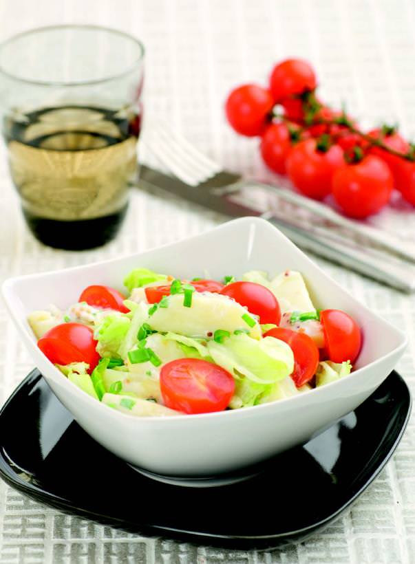 В привычных для нас салатах отварной картофель практически всегда используется с такими же отварными овощами (морковью, свеклой), а вот со свежими — крайне редко. Поэтому хочется разрушить стереотип и показать возможности более полезного и легкого употребления этого овоща. Салат Айсберг придает салату «Европа» легкость, хрустящую консистенцию, помидоры черри смягчают вкус острой заправки.