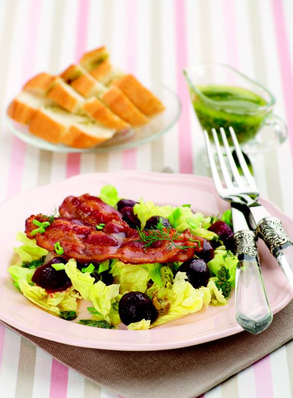 Свеклу тщательно вымыть щеткой, смазать оливковым маслом, тщательно упаковать в фольгу и поместить в духовку, нагретую до 200 ◦С, на 1–1,5 ч. Свеклу остудить, очистить от кожуры. С помощью ложечки для удаления сердцевины фруктов сформировать шарики из свеклы. Если такой ложки нет, нарезать свеклу крупными кубиками. Сделать заправку: смешать оливковое масло, сахар, соль, яблочный уксус. Залить шарики свеклы заправкой. далее оставить мариноваться в течение 30 мин. Свекла после маринования не закрасит своим соком другие ингредиенты салата. Для салатика взять только сердцевину салата-латука. Разобрать кочан на отдельные листы, при необходимости порвать их руками. Бекон обжарить до хруста. Получится английский или американский вариант шкварок. Мелко порубить небольшой пучок укропа без стеблей. В ступке растолочь каперсы, смешать их с оливковым маслом и укропом. Можно измельчить и с помощью блендера. На листья латука выложить свеклу, полить заправкой. Сверху выложить хрустящий бекон.