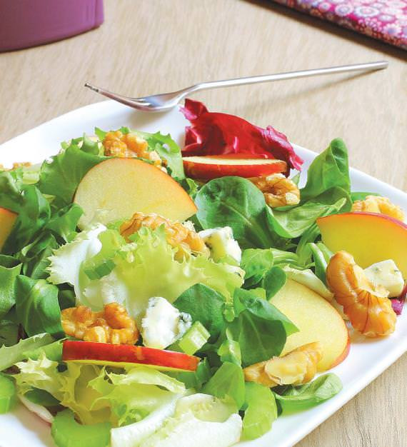 Листья салата вымойте, обсушите и выложите вперемешку на плоское блюдо. Яблоки вымойте, удалите сердцевину. Нарежьте ломтиками. Поместите поверх салата. Сыр нарежьте мелкими кусочками. Стебель сельдерея вымойте, нарезать тонкими колечками. Выложите подготовленные сыр и сельдерей на яблоки, посыпьте орехами. Полейте соком половинки лимона, затем приправьте перцем.