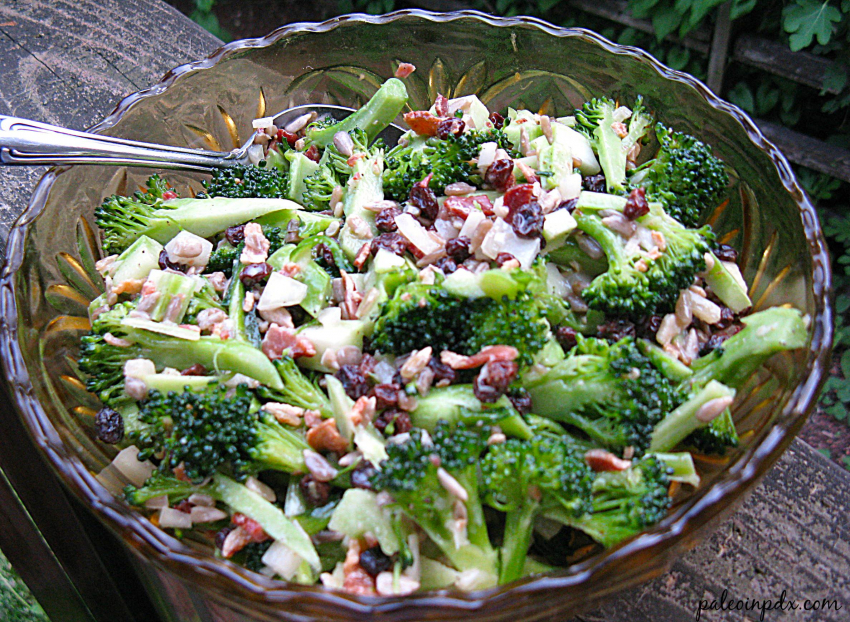 Изюм замочите на 2 часа в холодной воде, воду слейте. Брокколи вымойте, разберите на соцветия, отварите до готовности в соленой воде, откиньте на дуршлаг, остудите. Арахис подрумяньте, помешивая, без масла на сковороде. Очищенный лук нарежьте кольцами, бекон — тонкими полосками. Соедините подготовленные продукты, разложите в салатники или широкие стаканы. Заправьте маслом.