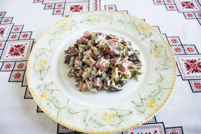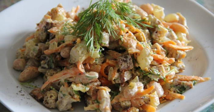 - Все компоненты перемешивают да заправляют майонезом. Отправляют блюдо в холодное место для пропитки, украшают измельченной зеленью, а затем подают к столу.